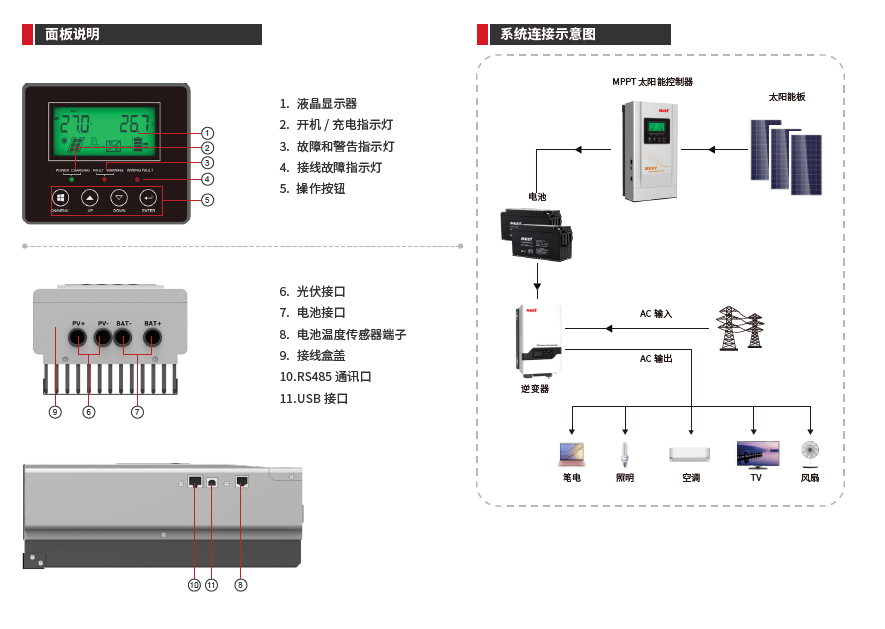| 保護功能 | 太陽能高壓斷開; 太陽能高壓重連; 蓄電池高壓斷開; 蓄電池高壓重接; 高溫斷開;高溫重新連接 | |||||||||||