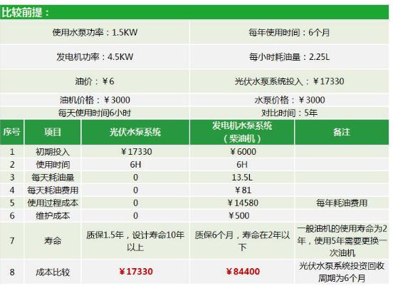 1.5KW光伏水泵系統(tǒng)與同功率柴油水泵系統(tǒng)投資對比